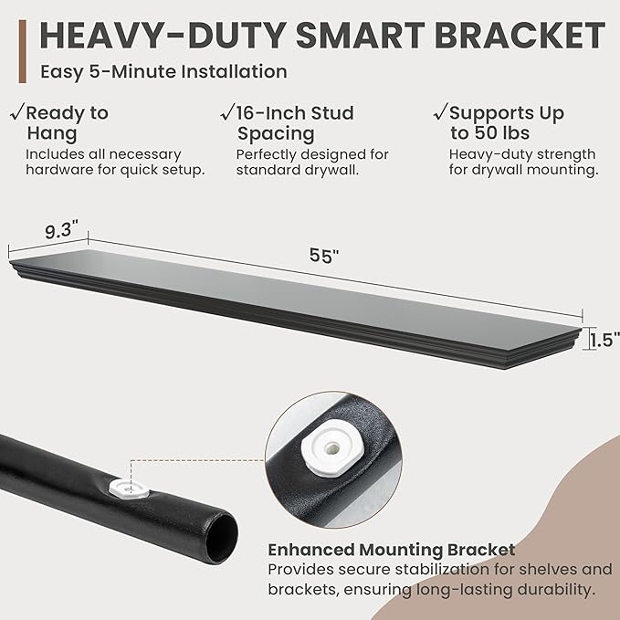 - Package Contents: 1 black floating shelf included, board dimension: 55" Wide x 9.3" Deep x 1.5" Height. Other accessories: 1 metal brackets, 1 magnetic level, 3 wood iron connection screws, 9 wall screws and expansion tubes, and 1 installation manual