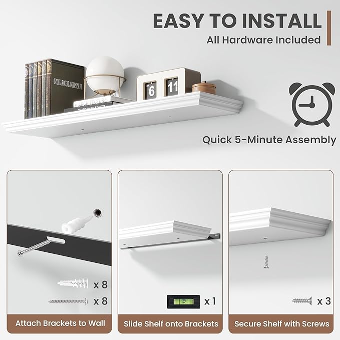 - Package Contents: 1 white floating shelf included, board dimension: 35.5" W x 7.9" D x 1.5" H. Other accessories: 1 metal brackets, 1 magnetic level, 3 wood iron connection screws, 8 wall screws and expansion tubes, and 1 installation manual