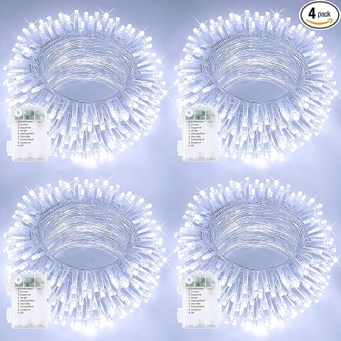 4 Pack String Lights Battery Operated with Timer, 132FT 400 LED Waterproof Battery Twinkle Lights, 8 Modes Fairy Light for Indoor Outdoor Party Bedroom Garland Tree Christmas Decorations (Cool White)