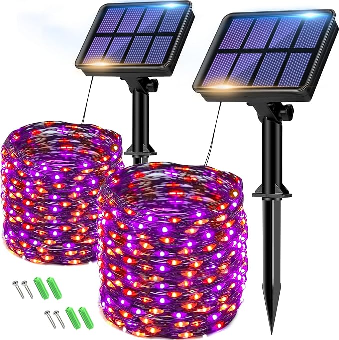 - 2 Packs Solar Halloween Lights Outdoor: Each Ultra-Bright fairy lights solar with 80 LED 33 FT (26.5 ft light string +6.5 ft lead wire), total 160 LED with orange & purple light beads, emitting a Spooky and wonderful light, creating an atmosphere of mystery and horror for Halloween party