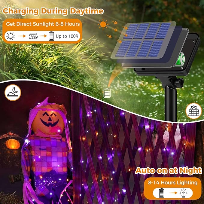- Waterproof Design for All Weather: Light string and solar panel are IP65 waterproof to withstand any weather, either rain, sun, or snow. Safe for outside use, Don't worry about short circuits or bad weather damage (can't soak in water), glow with a orange purple light after rain, make your patio unique and mysterious