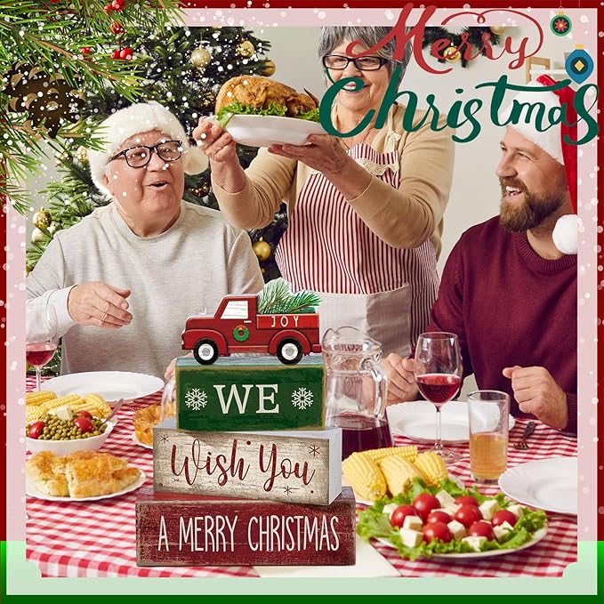 - Christmas Tree Tiered Tray Decorations: Christmas tiered tray decor set is designed in the shape of a classic red truck sign and books, come with 4 wooden signs, 1 red truck sign and 3 wood decoration books; Vibrant Christmas centerpieces are suitable for Christmas parties and home to welcome the holiday