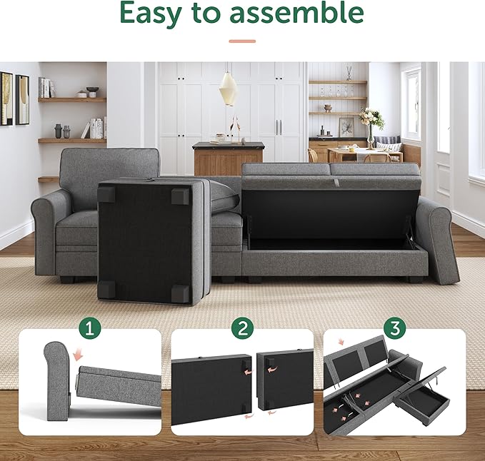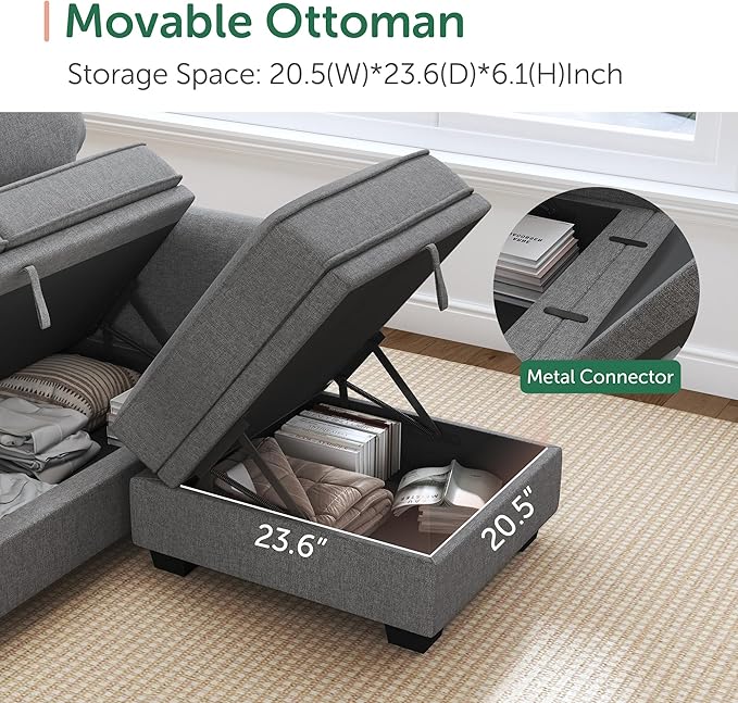 - Spacious Sofa:This Storage sectional sofa is made with a sturdy solid wood frame and cushions filled with high-density sponge and wrapped in 100% linen fabric