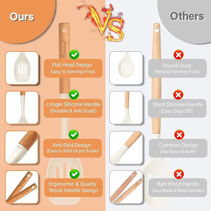 - ๐ฅใComfortable & Ergonomic Wooden HandleใThis Silicone Cooking Spoons are designed with natural wood handle. The smooth round handle can reduce hand fatigue during prolonged cooking sessions.The natural wood provides a secure grip, resists heat transfer, and complements modern kitchen aesthetics, and fits comfortably in your palm, offering precision for delicate tasks like flipping eggs or portioning pasta.