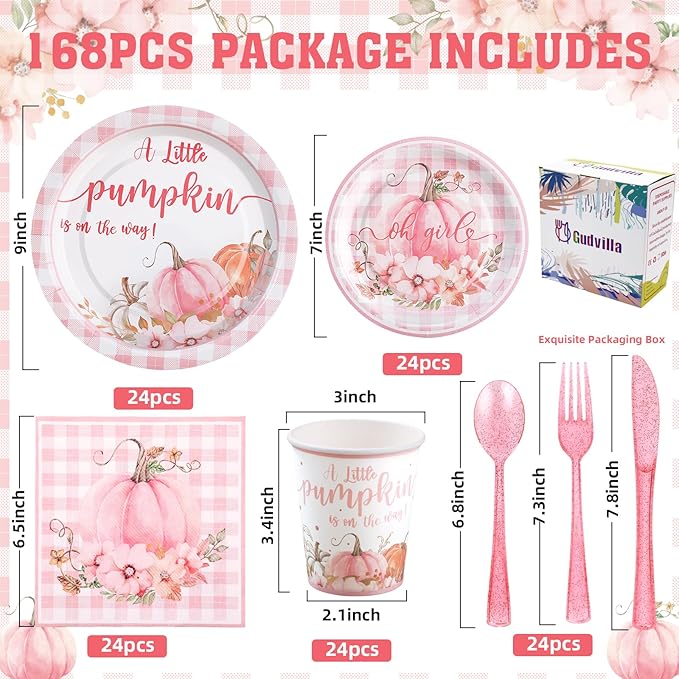 - 【Pumpkin Themed Baby Shower】- A sweet little pumpkin is on the way girl include 24 9 inch pumpkin baby shower plates, 24 7-inch a fall baby shower plates, 24 little pumpkin cups, 24 2-ply little pumpkin napkins, 24 sets of pink plastic utensils (forks, spoons, knives), 168 pieces in total. This is a great fall baby shower plates and napkins sets.