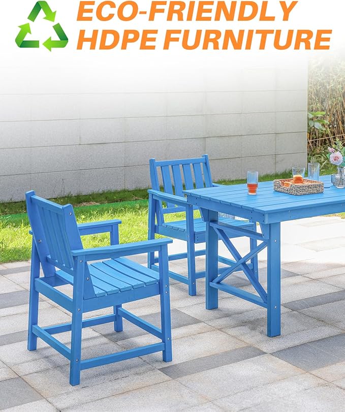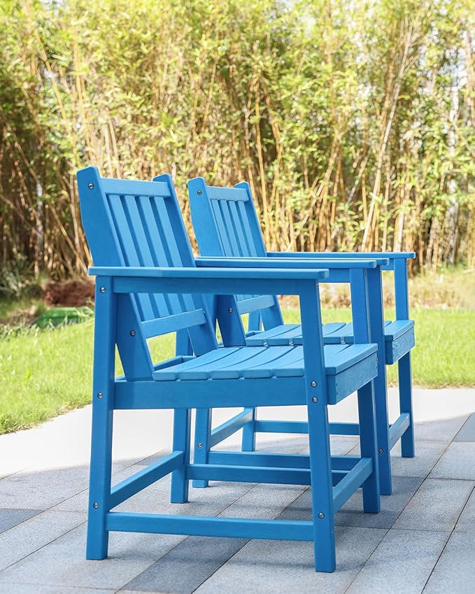 - Durable Eco-Friendly HDPE Construction: Crafted from 100% recyclable, military-grade high-density polyethylene, this 2-pack patio chair set offers long-lasting durability and a realistic wood grain finish. Resistant to fading and UV damage, these eco-friendly chairs bring natural wood look and feel without the maintenance—perfect for all your outdoor settings from patios to pool decks. The sky blue option adds a refreshing touch that blends beautifully with oceanfront patios, garden greenery, or modern outdoor aesthetics.