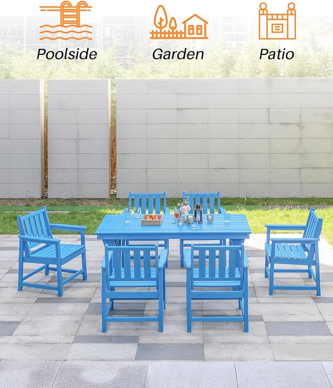 - Versatile Seating for Multiple Occasions: Sized at 22.8"L x 22"W, these chairs fit well with most patio dining tables, including SeeHill’s matching sets. Whether you’re hosting a garden brunch, poolside party, or casual family dinner, this 2-pack adds flexible, stylish seating that complements any outdoor décor. Choose the sky blue finish to introduce a cheerful yet calming accent that works across a wide variety of design themes.