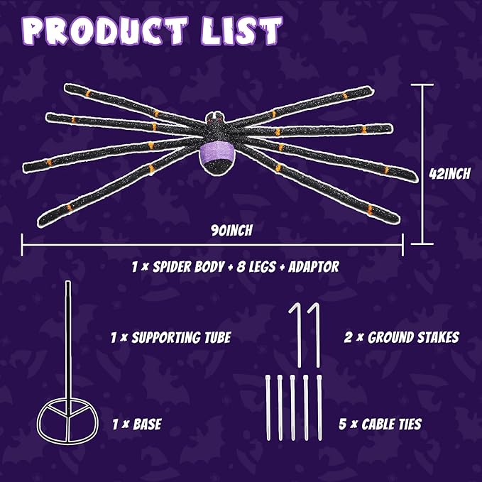 - ๐ง Effortless Setup Halloween Decorations: Package includes: 5ft power cord, cable ties, ground stakes, support tube & baseโno tools needed.Assemble this massive scary spider (66" x 42" x 22") in minutes!