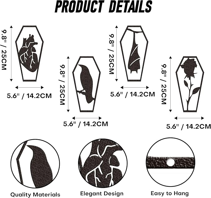 - Horror Décor Collection Essential: Already own gothic home accents? This 4-piece set is a must-add to your horror décor collection. Each coffin radiates a creepy atmosphere, transforming walls into captivating, spine-chilling focal points for you and guests.