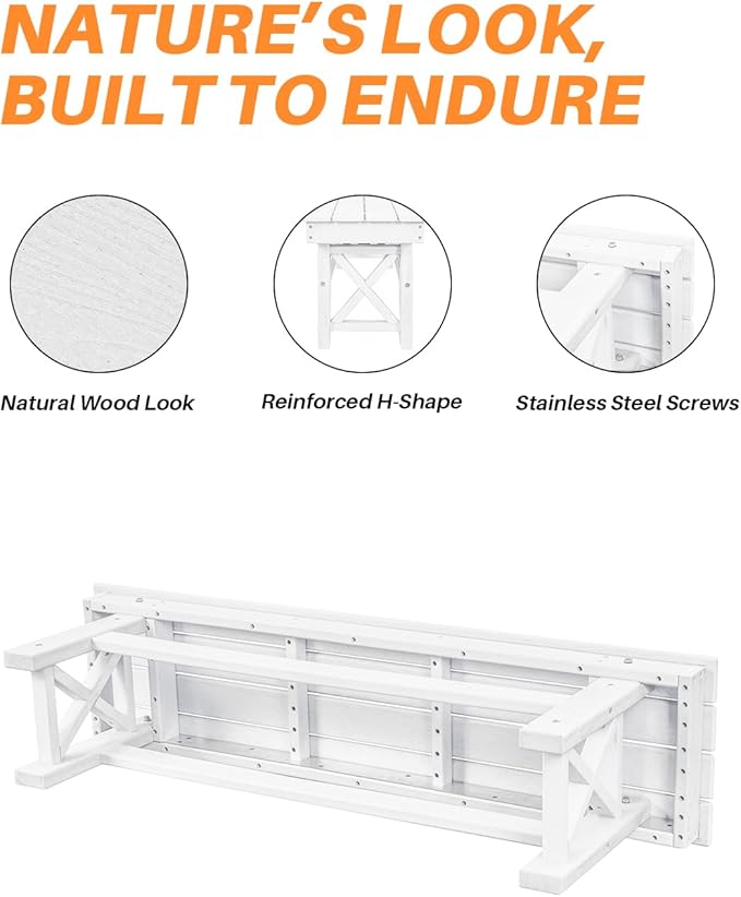 - Premium Military-Grade HDPE Construction: Crafted from military-grade high-density polyethylene (HDPE), this bench features a lifelike 3D wood grain surface that’s fade-resistant, crack-proof, and waterproof—even under extreme sun or freezing cold. Food-grade safe and 100% recyclable, this pearl White bench offers eco-conscious comfort and resilience without the hassle of repainting or sanding.