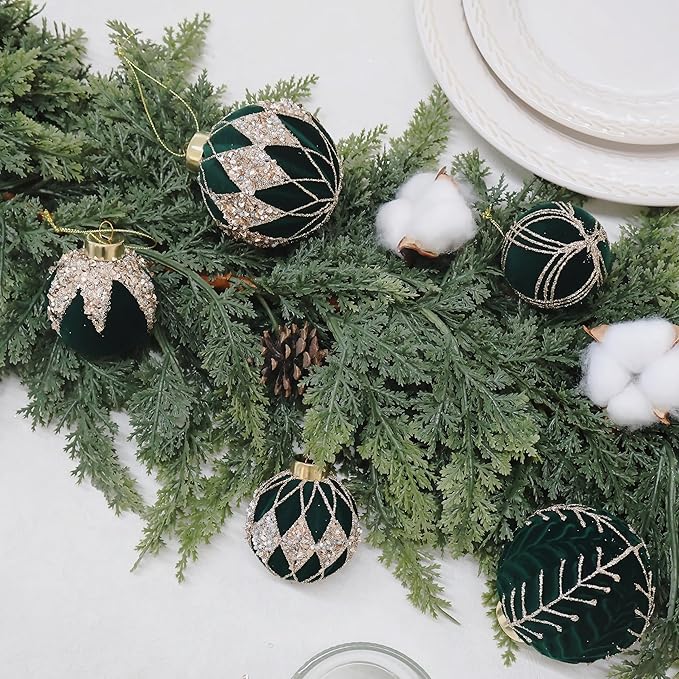 4inch Velvet Ornaments for Christmas Tree, 9PCS Glitter Flocked Christmas Ornaments Decorations Balls Set Decor Green