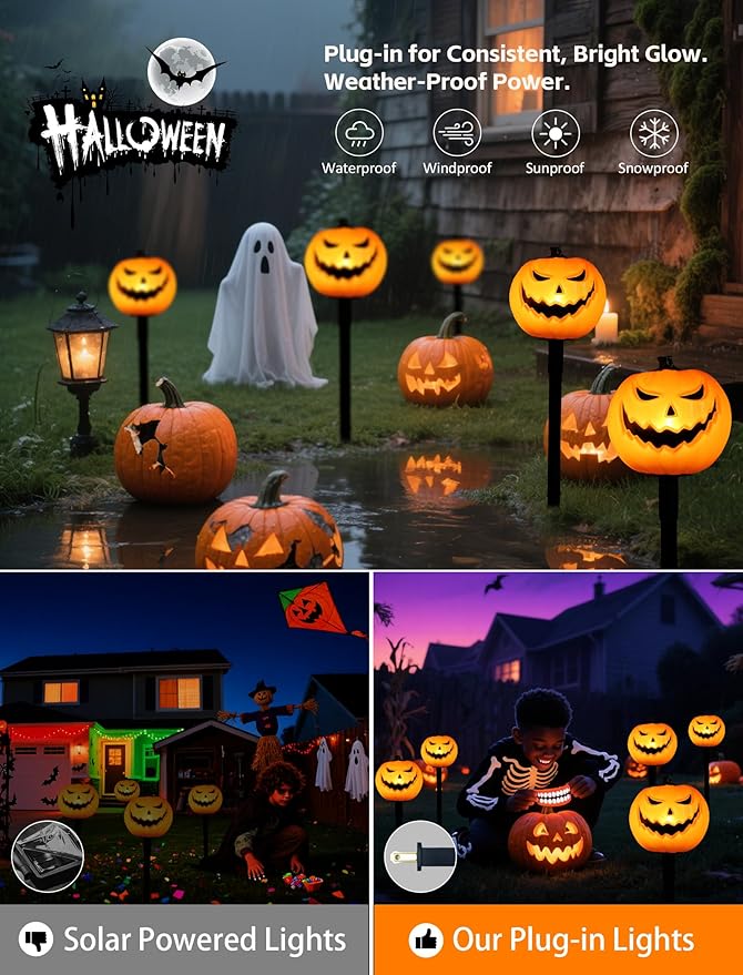 - ๐ก THE CONSTANT GLOW OF CHERISHED MEMORIES | Say goodbye to the flickering uncertainty of solar lights. Our reliable plug-in design ensures your pumpkin path shines with a consistent, warm amber light, night after night, all season long. Itโs the dependable, worry-free illumination you need to keep the festive spirit alive, bringing a touch of classic movie magic to your own front yard