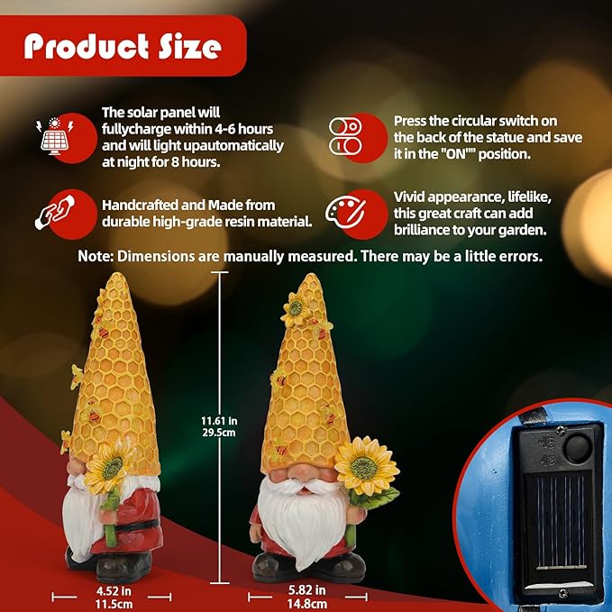 - 【 Ideal Gift 】:Adorned with four glowing bees on its hat and a glowing sunflower in its hand, this gnome statue is as cute as it is functional. This gnome decor makes for a wonderful surprise gnome stuff gift for anyone who loves unique and charming outdoor decorations.
