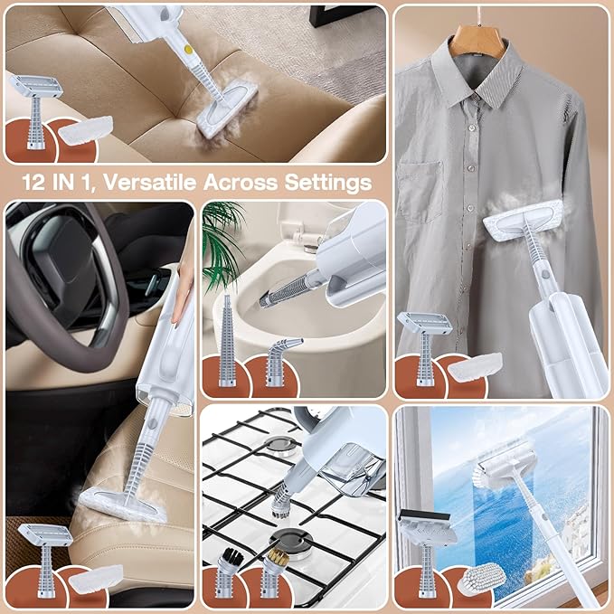 - 10-in-1 Multi-purpose Accessories and 350ml Water Tank: ScrubWiz steamer for cleaning equipped with 10 brush heads and 350ml water tank, steam mop not only simplifies floor and carpet cleaning tasks but can also be used for cleaning windows, clothing creases, gaps, stoves, sofas, and cars, providing a comprehensive cleaning experience