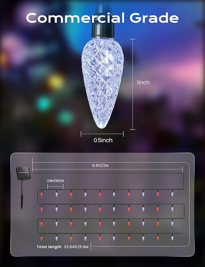 - [50LED Solar C6 Strawberry Christmas Lights] The 50 led C6 strawberry solar lights will bright up your Christmas, Halloween, Thanksgiving day and autumn holiday, bring magical and brightness to your home. Total length: 22.64ft, lead wire length: 6.56ft, space between LEDs: 4 inch