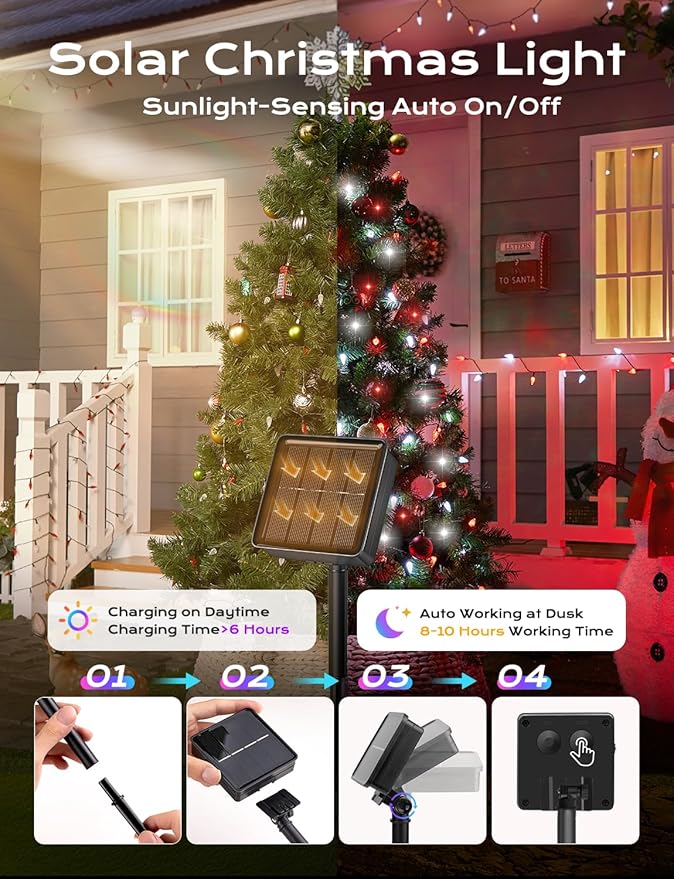 - [8 Lighting Modes Function] 8 Modes(combination, in wave, sequential, slo glo, chasing/flash, slow fade, twinkle/flash, and steady on). Press the button on the solar panel to switch the lights on and choose light modes to satisfy your needs