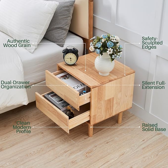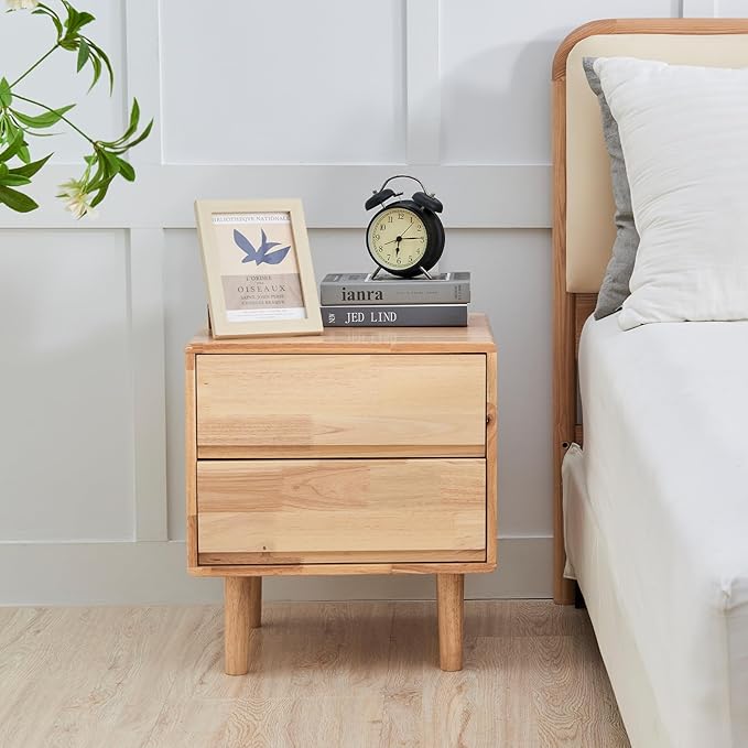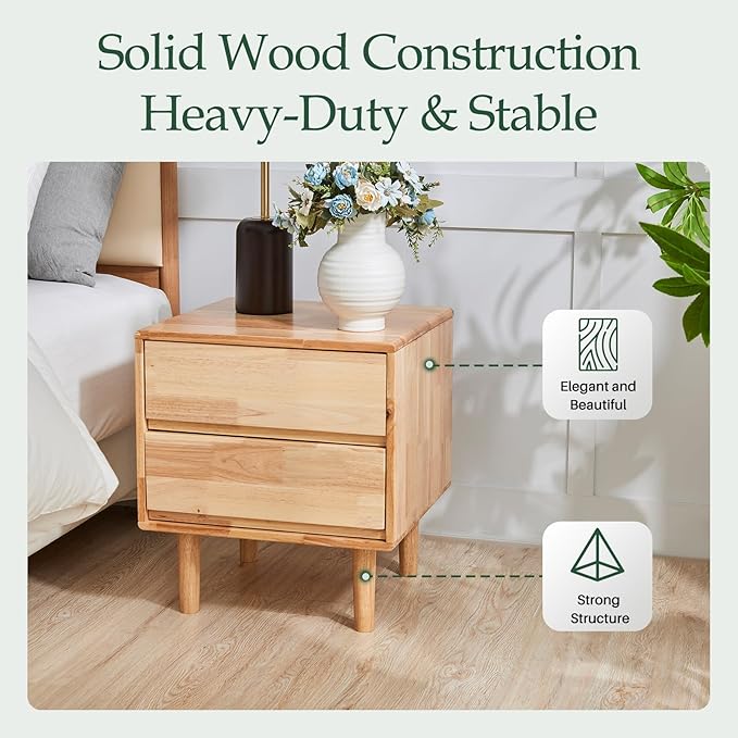Modern Solid Wood Nightstand with Drawers - Mid Century Modern 2 Drawer Natural Wooden Small Narrow Nightstand Bedside Side End Table with Storage for Living Room Bedroom, 15.7" D x 17.1" W x 19.6" H