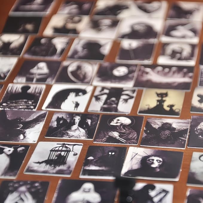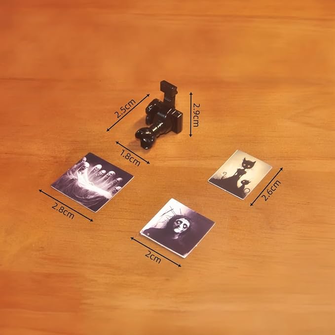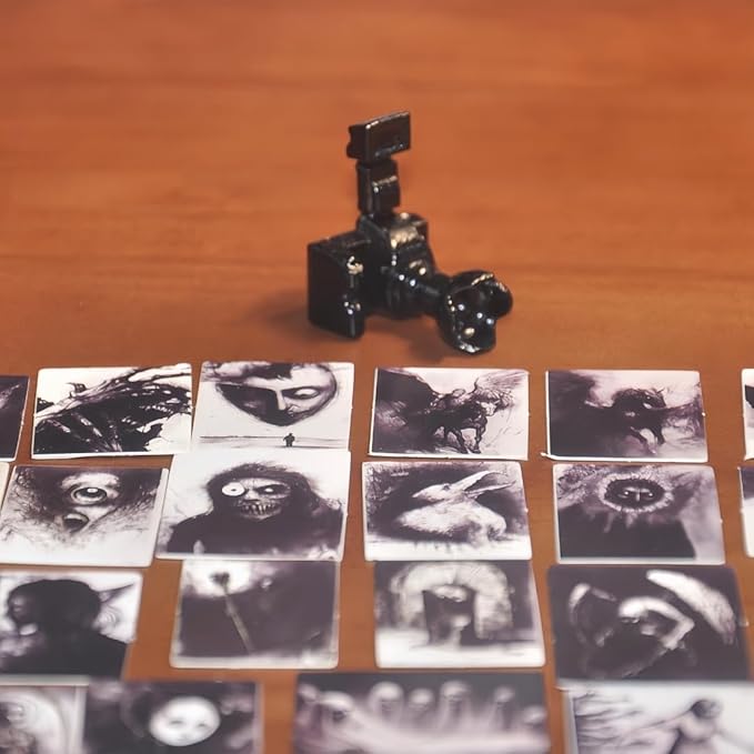 • Centerpiece Miniature DSLR Camera Prop: Features a realistic, miniature black DSLR camera (perfect 1:6 scale detective or paranormal investigator prop) plus dozens of unique miniature darkened horror posters & abstract charcoal art pieces.