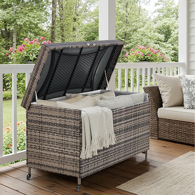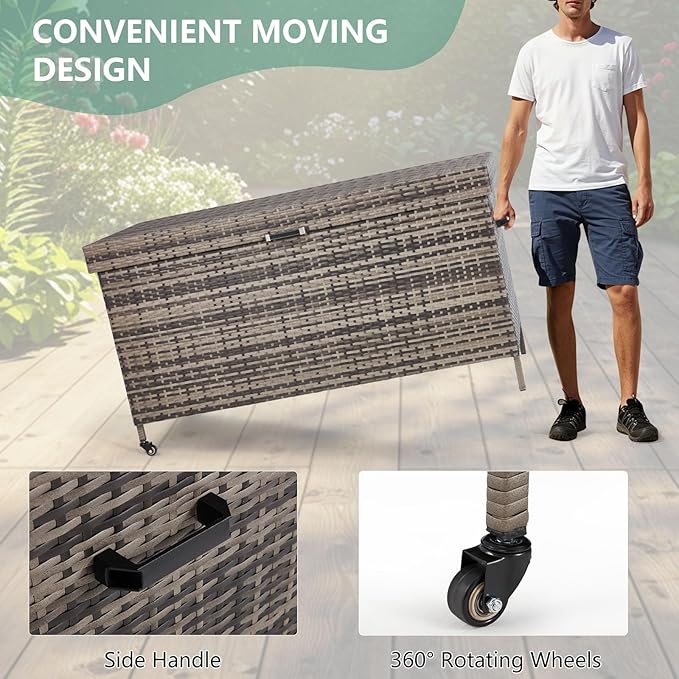 - Handcrafted Wicker Weaving: Our waterproof 240 gallon deck box is made from a selection of uv- and fade-resistant polyethylene rattan, these bins can withstand all weather conditions. To prolong the life of your rattan storage box, we recommend that you keep your storage box indoors when it is raining heavily