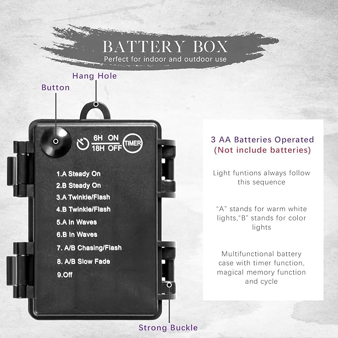 - ๐ PRE-LIT MAGIC - 25 energy-efficient LED lights (warm white + multicolor) with 8 dynamic lighting modes! Battery-powered (3 AA required, not included) and featuring a convenient timer button for instant, mesmerizing ambiance. Cast a spellbinding glow for trick-or-treaters or set a playful party mood.