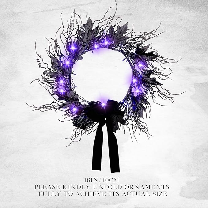 - ๐ PERFECT PROPORTIONS - This 16-inch black Halloween wreath delivers classic spooky vibes in an ideal door-ready size. Featuring eerie black maple leaves and integrated color-changing lights, it effortlessly elevates your haunted entryway or mantel while embodying Halloweenโs signature dark allure.