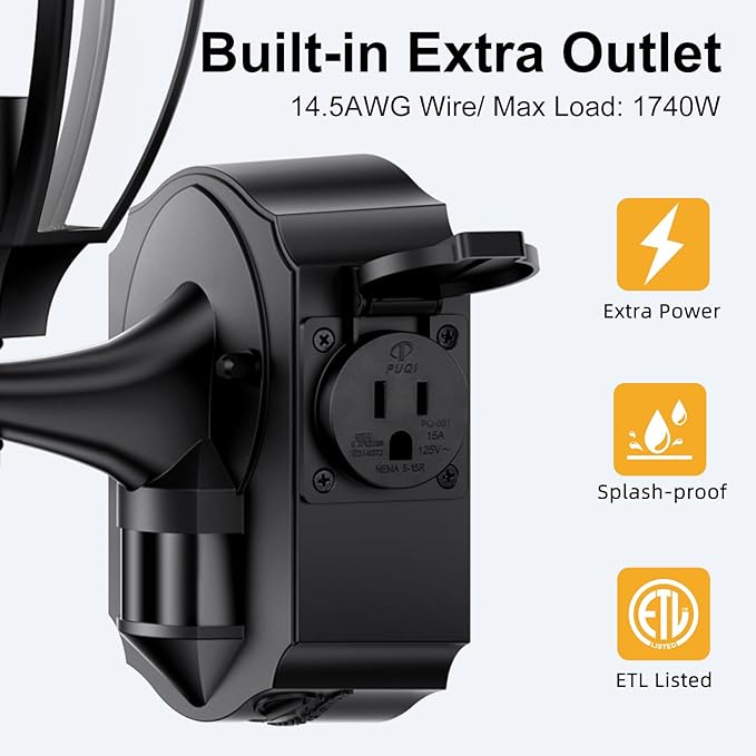- Convenient Bulit-in Outlet: Both of our motion sensor outdoor lights include an additional outlet, which be used for a variety of things, such as connecting and powering holiday lights for Halloween and Christmas, powering outside video camera or a leaf blower and more (Max power 14.5AWG and Max Load 1740W)