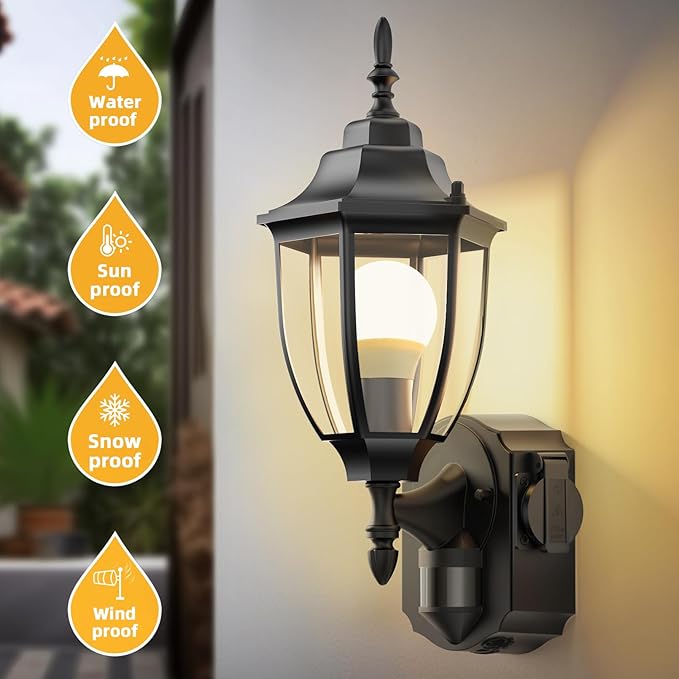 2 Pack Porch Lights Outdoor with Outlet, Motion Sensor Outdoor Wall Lights, Updated Dusk to Dawn Exterior Lighting Fixtures Waterproof Anti-Rust Aluminum Outside for House Entryway Garage, Black