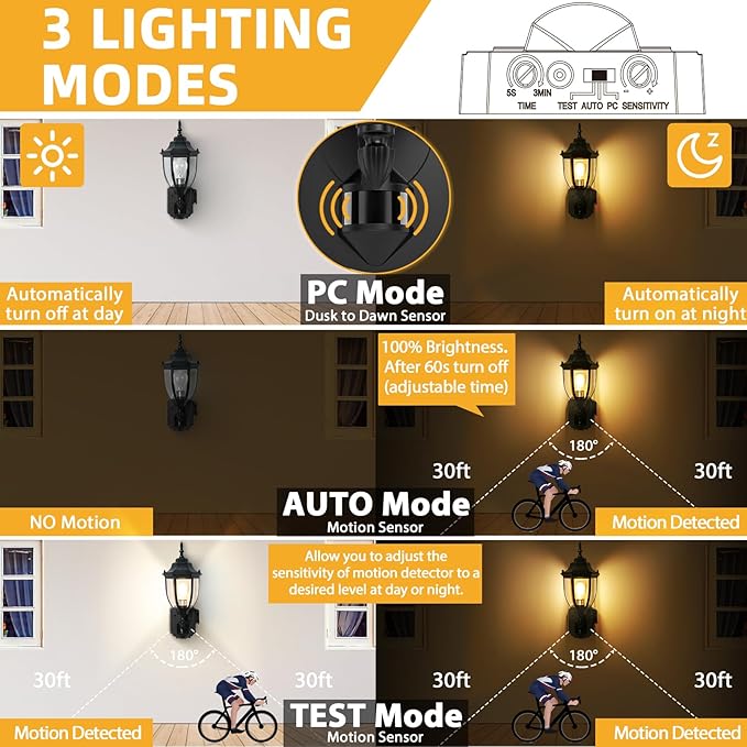 - Upgraded 3 Lighting Modes: ①TEST Mode: Allows you to adjust the sensitivity of motion detector to a desired level at day or night. ②PC Mode: Light turns on at dusk and off at dawn automatically. ③AUTO Mode: Motion detector turns light on auto after sensing movement in its coverage area at dusk, and stays on under motion-detected. When motion stops, light will be on for the predetermined time you set (5sec. to 3 min.)