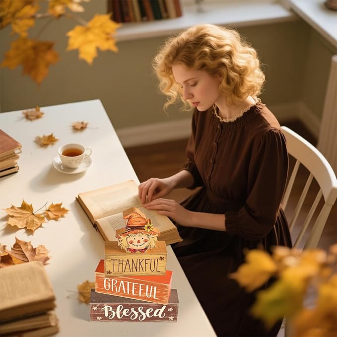 - Comprehensive Packaging: this package comes in 1 funny scarecrow wooden sign with sunflower and 3 faux stacked books, offering you multiple elements to employ in your decorating adventures; Stacked books are printed with thankful grateful and blessed, nice addition to your Thanksgiving fall decor