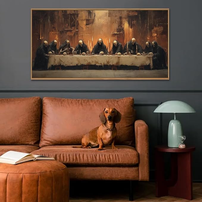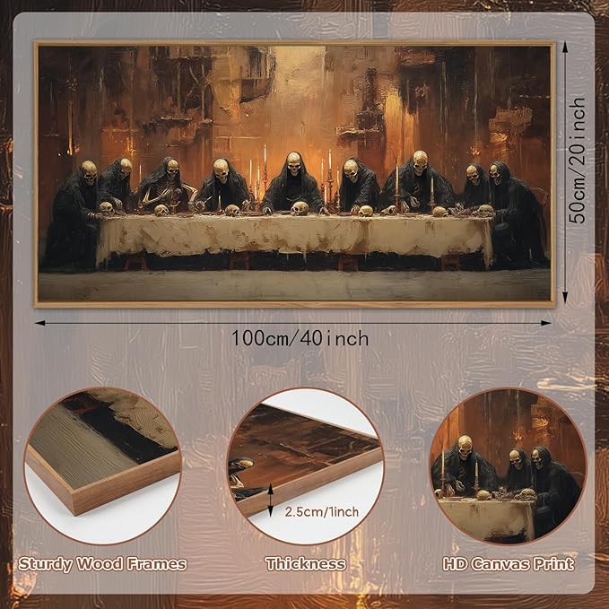 - 【Skeleton Canvas Wall Art】 This horror skeleton wall painting features nine skeletons dining around a table,inspired by the painting "The Last Supper".It is both humorous and creative.Hang it in your indoor space and it will bring you endless inspiration and fun