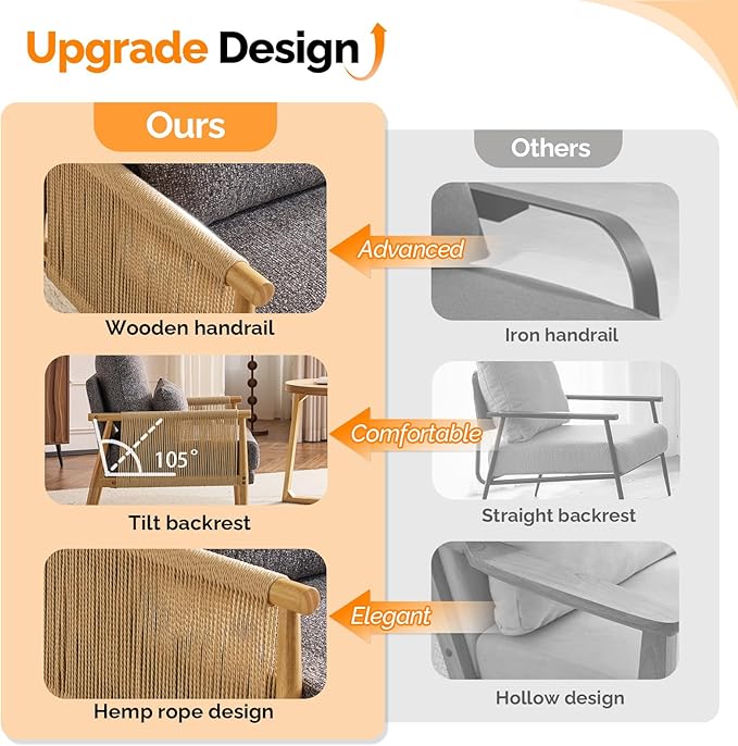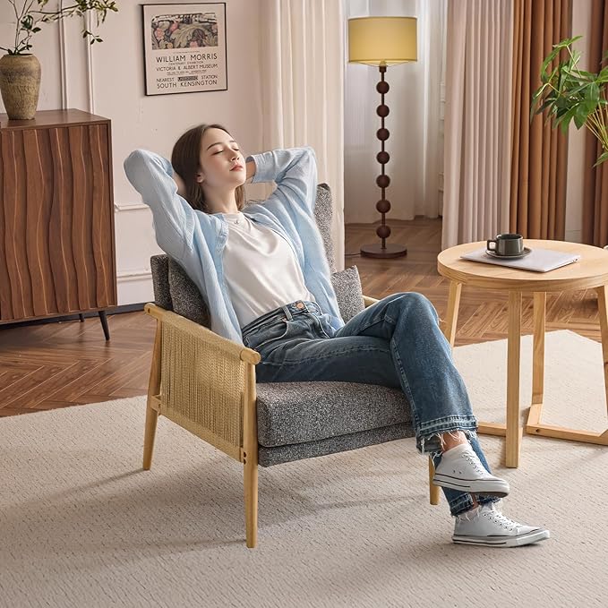 - Braid Design : The Boho-inspired Braid Accent Chair showcases elegant paper cord weaving across its angled armrests. Its thoughtful design combines comfort and style with a medium-height backrest and plush cushioning. This piece seamlessly blends casual and sophisticated interior comfort, perfect for home decoration.The two chairs will be shipped in separate packages. Please note that they may not arrive at the same time.