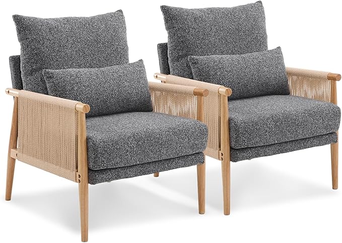 VINGLI Boho Braid Accent Armchairs Set of 2,Mid-Century Modern Chiars with Solid Wooden Armrest,Comfy Louge Cushion Chairs with Waist Pillow for Bedroom,Living Room,Reading Room, Gray