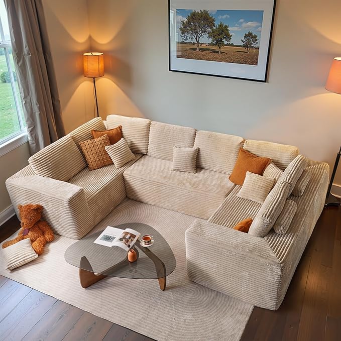 ovios Sectional Cloud Couch for Living Room, Modular Floor Sofa with Plush Corduroy, No Assembly Required, Big Comfy Couches Set with Fluffy Memory Foam, Stupendous U Shaped Sofas with Chaise, Grey