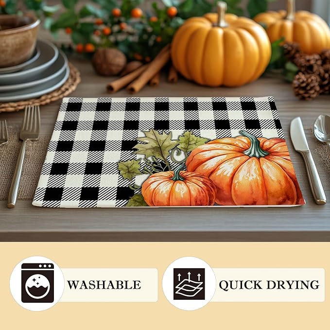 Hello Pumpkin Placemats Set of 4, 12x18 Inch Black Fall Buffalo Plaid Table Mats, Washable Heat Resistant Place Mats for Kitchen Dining Table, Autumn Home Farmhouse Decor-B02
