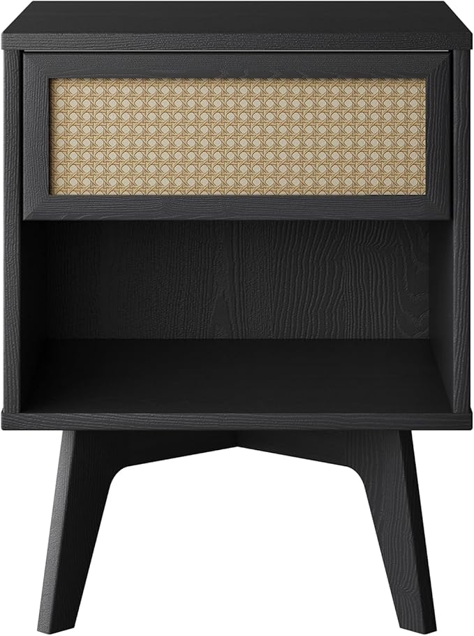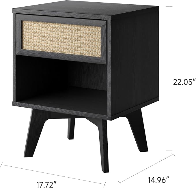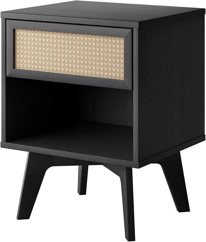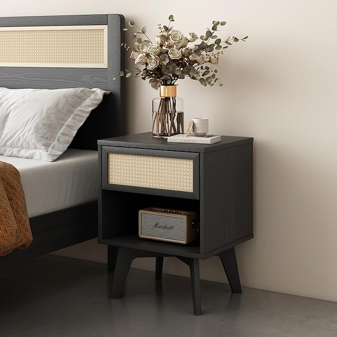 MUSEHOMEINC Nightstand, Boho Bedside Table with Rattan Drawer Open Shelf, Black Wooden Night Stand with Storage, Mid Century Modern End Table for Bedroom, Living Room,Dorm and Small Spaces