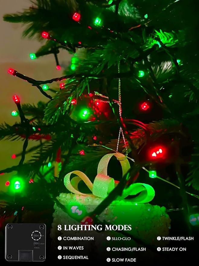 - Unique Red and Green Solar Twinkle Lights: The solar powered LED string lights outdoor is made with upgraded super bright LEDs, higher solar energy conversion with upgraded solar panel. Green wire matches the color of your Christmas trees and the cool white LED light is so perfect for Xmas Winter Theme. Each set contains 4pcs of string lights, each string lights is 33ft long with 100LEDs + 4.9ft leading wire