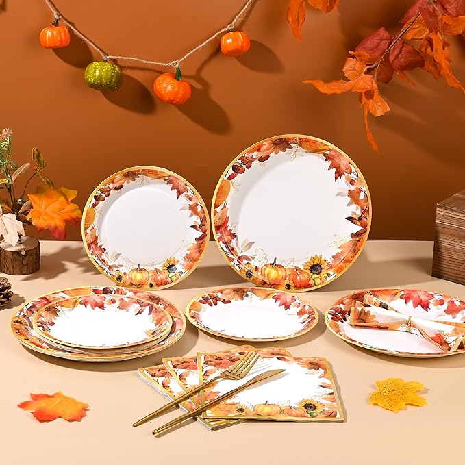 - Fall Paper Plates and Napkins---Complete set with 9" thanksgiving maple leaves plates *50, 7" fall paper plates *50,6.5" napkins *50,serve 50 guests. Sufficient quantity can meet your fall party decor thanksgiving party supplies needs and also enough for party usage needs, your guests will love decorative disposable plates