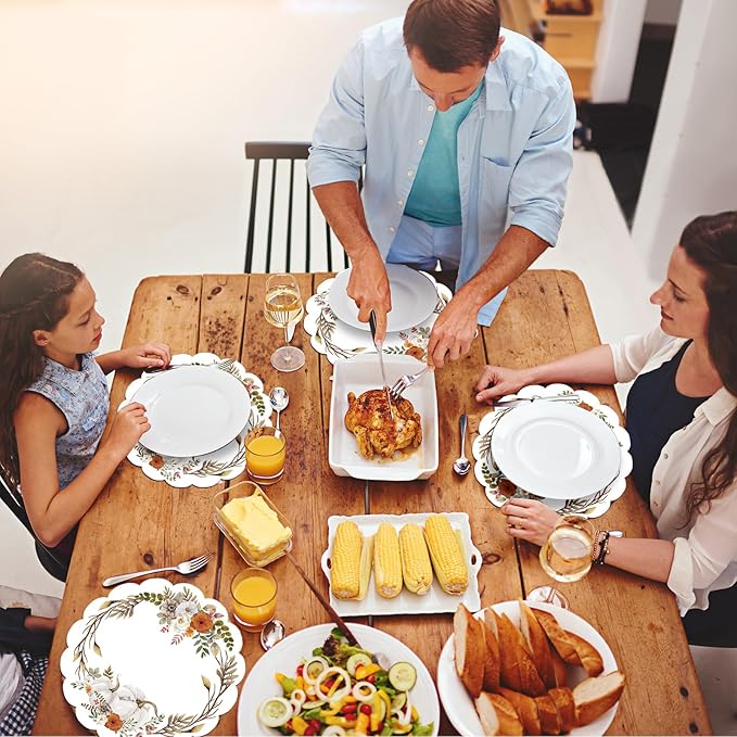 - Fall Flower Oval Design:Our disposable placemats is themed in white and printed with floral and maple leaf patterns. The simple and elegant autumn element design adds a warm and lively atmosphere to the party, instantly brightens up the table, making them practical and at the same time perfect decorations to help you and your friends have a great party!