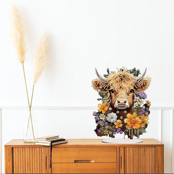 Diamond Painting Kits for Adults Beginners, 5D Full Drill Highland Cattle Crystal Art Desktop Ornament, DIY Single Sided Home Office Desk Decor, Creative Craft Gift Set with Tools
