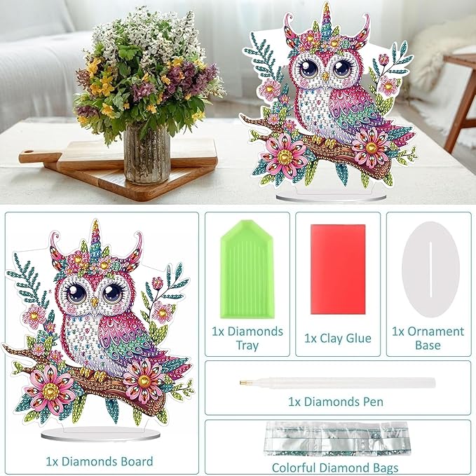 Diamond Painting Kits for Adults Beginners, 5D Full Drill Owl Crystal Art Desktop Ornament, DIY Single Sided Home Office Desk Decor, Creative Craft Gift Set with Tools