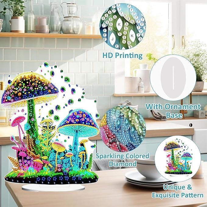 Diamond Painting Kits for Adults Beginners, 5D Full Drill Mushroom Crystal Art Desktop Ornament, DIY Single Sided Home Office Desk Decor, Creative Craft Gift Set with Tools