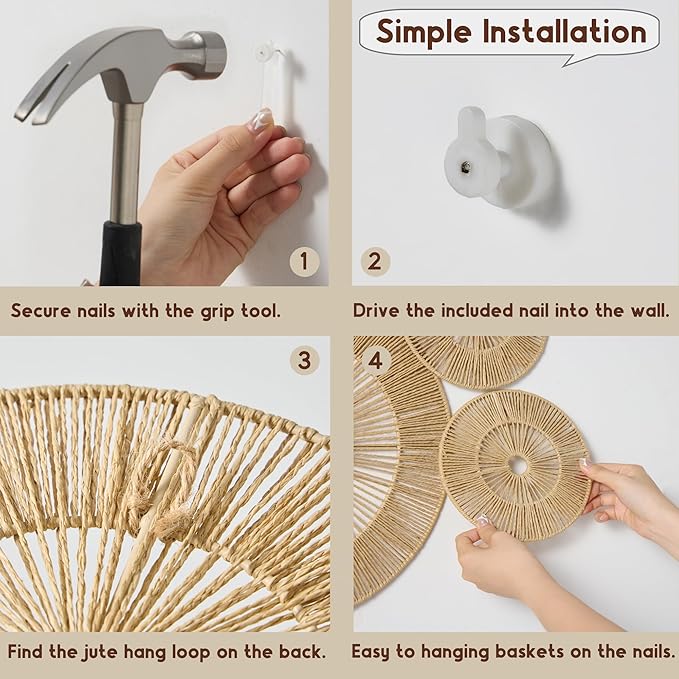 - Included Installation Kit & Ready to Hang: Each sturdy basket come with a woven jute loop at the back for easy hanging. Included 7 mini damage-free nails and a safety installation grip that protects your hands from hammer injuries, scratch-proof mounting that protects your walls