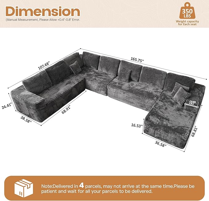 Cloud Sectional Couches for Living Room,U Shaped Modular Sofas No Assembly,165x107 Inches Plush Corduroy Oversized Floor Couch Set with Deep Seat Chaise,Grey