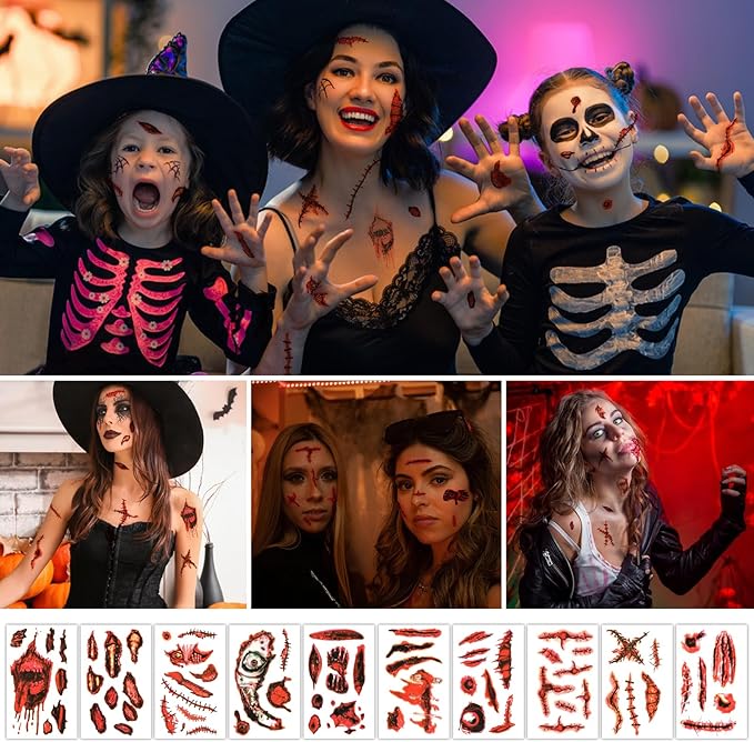 - PACKAGE INCLUDES: 8 sheets bloody handprint and footprint window stickers with 10 sheet Halloween wound tattoos (approximately 165 stickers)