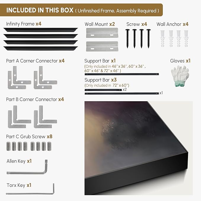 - Assembly Required: The artwork comes with the frame components unassembled. Don¡¯t worry - setup is straightforward and tool-friendly. For best results and accurate alignment, we recommend two people to ensure a smooth assembly and a stable, secure wall mount.