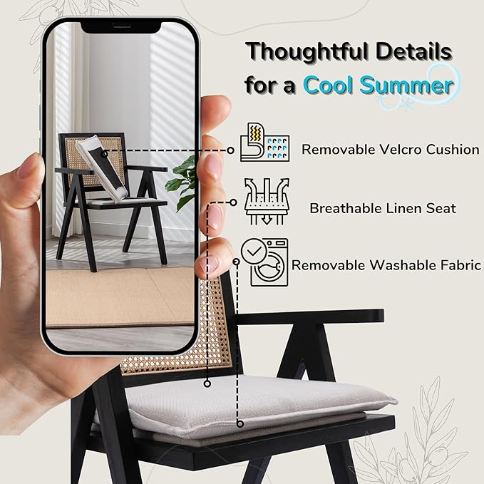 - Detachable Cushion & Arm Support This dining room chair with arms features a machine-washable linen cushion (secured by Velcro) for easy maintenance. The supportive armrests make it ideal for family gatherings or afternoon tea sessions