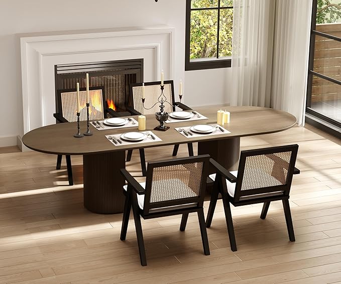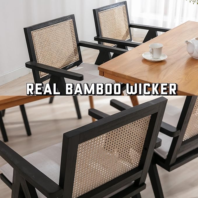 Rattan Dining Chairs Set of 6, Farmhouse Wicker Dining Chairs with Removable Linen Cushion Accent Cane Armchair for Dining Room Kitchen Restaurant, Black