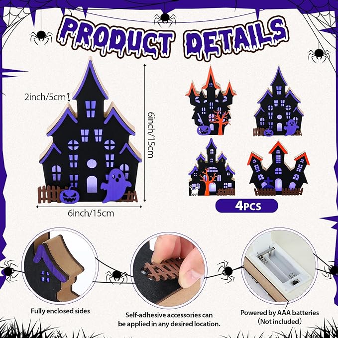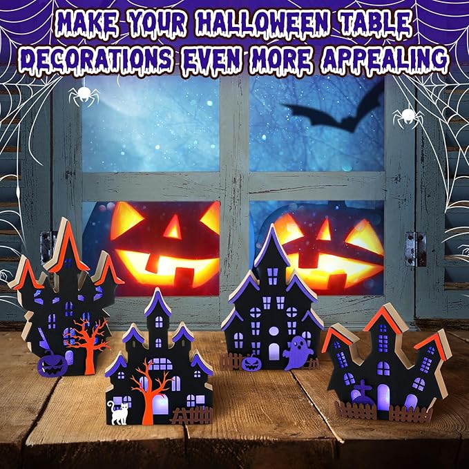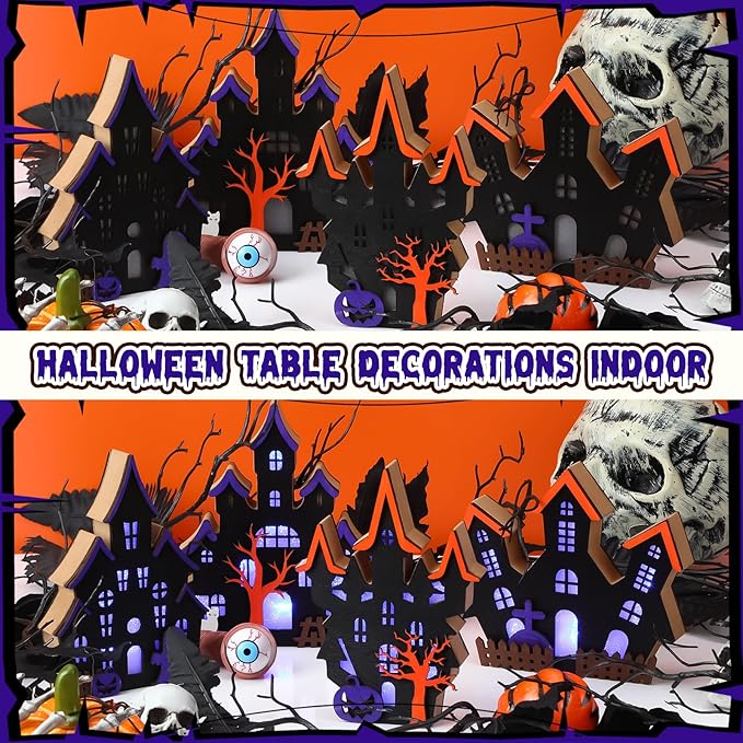 - Spooky Halloween Village Set: this 4 piece Halloween tabletop decoration set features wooden lighted ghost house designs; Ideal for creating a haunted village or adding eerie charm to your space, these mini houses cast a ghostly glow to set the Halloween mood