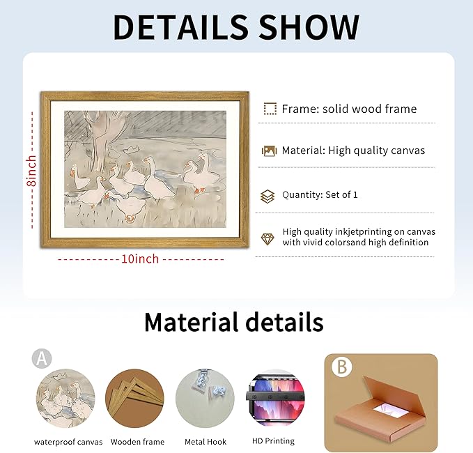 - Premium Framed Canvas Wall Decor – Printed on high-quality canvas and professionally mounted in a sturdy vintage-style wood frame, this Rustic Farm Duck Decor combines durability with artistic beauty—ready to hang and enjoy.