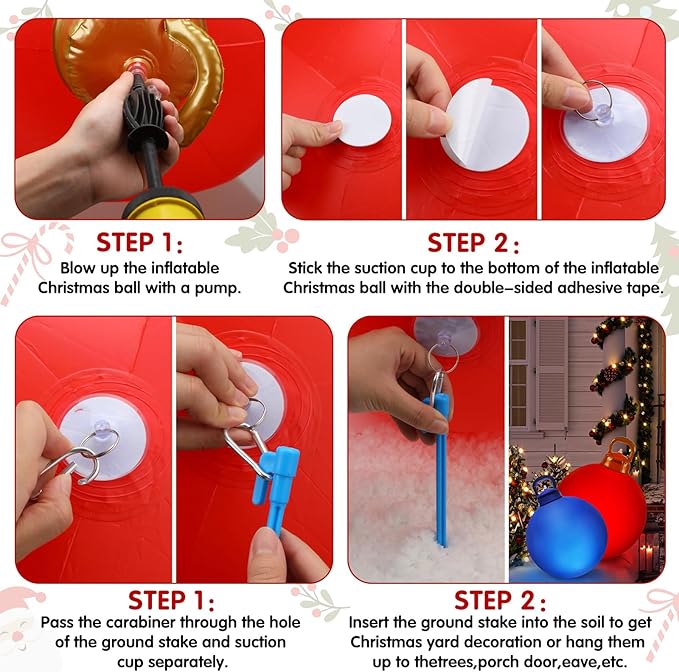 - Easy to Install: these large outdoor Christmas decorative balls are simple and convenient to install, no assembly is required, and you can use them after inflating (air pump not included); You can hang them in your garden, courtyard, porch or tree, etc.; You can use it to decorate anywhere you want; Deflate directly when not in use